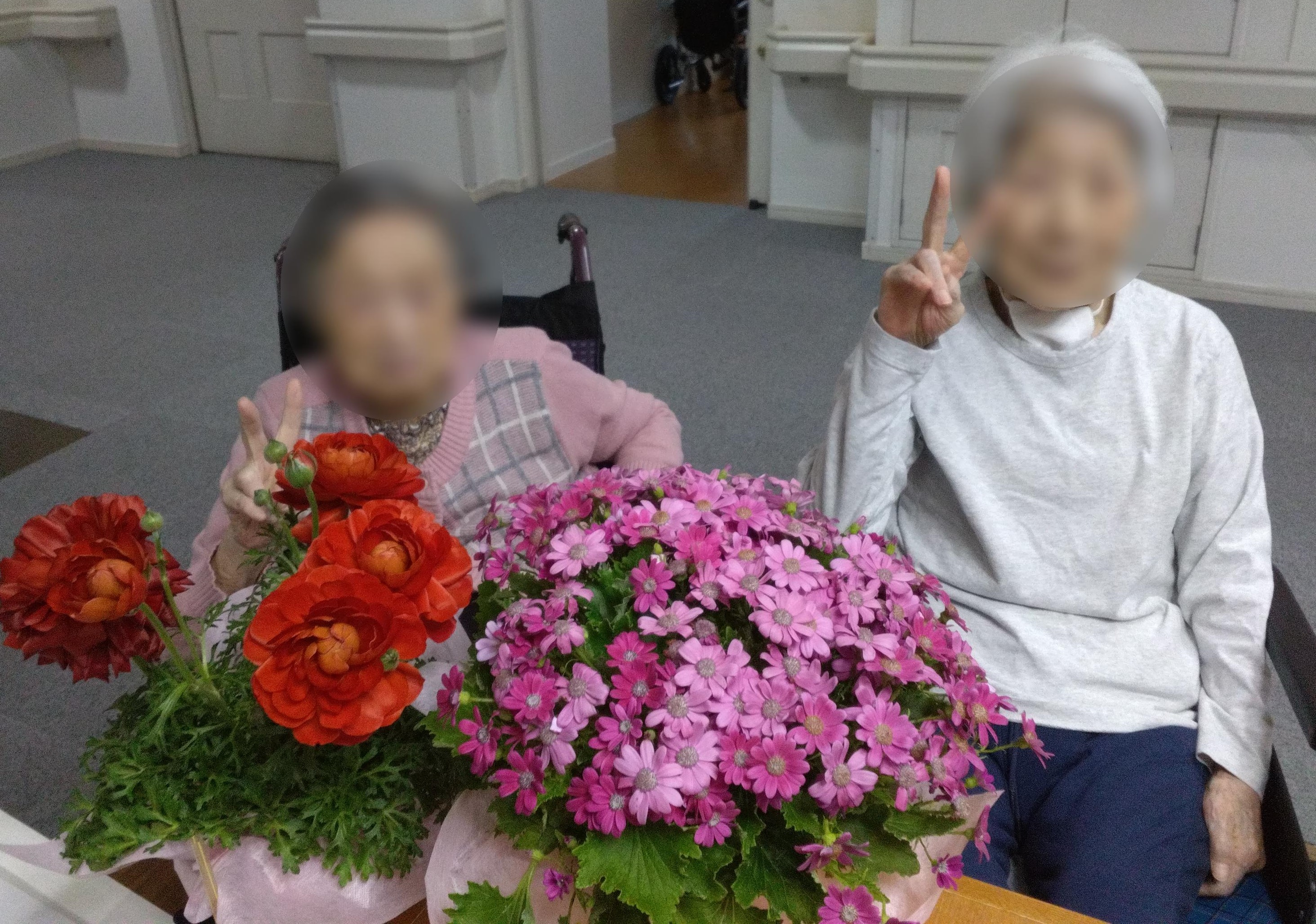 フォトギャラリー 2024.03.20 六ッ川西保育園からお花の贈り物 3月19日、毎月交流会を開催している六ッ川西保育園からお花の贈り物がありました。「どちらもかわいいお花ね」「なんてお花かしら?」「さっそくお花の名前を調べなきゃ」と、ご入居者様も贈り物のかわいらしいお花を囲んで話がはずみます。いただいたお花は施設の花壇へ植え替えをして皆で育てていきます。 < 園芸はじめました琴の演奏会 >