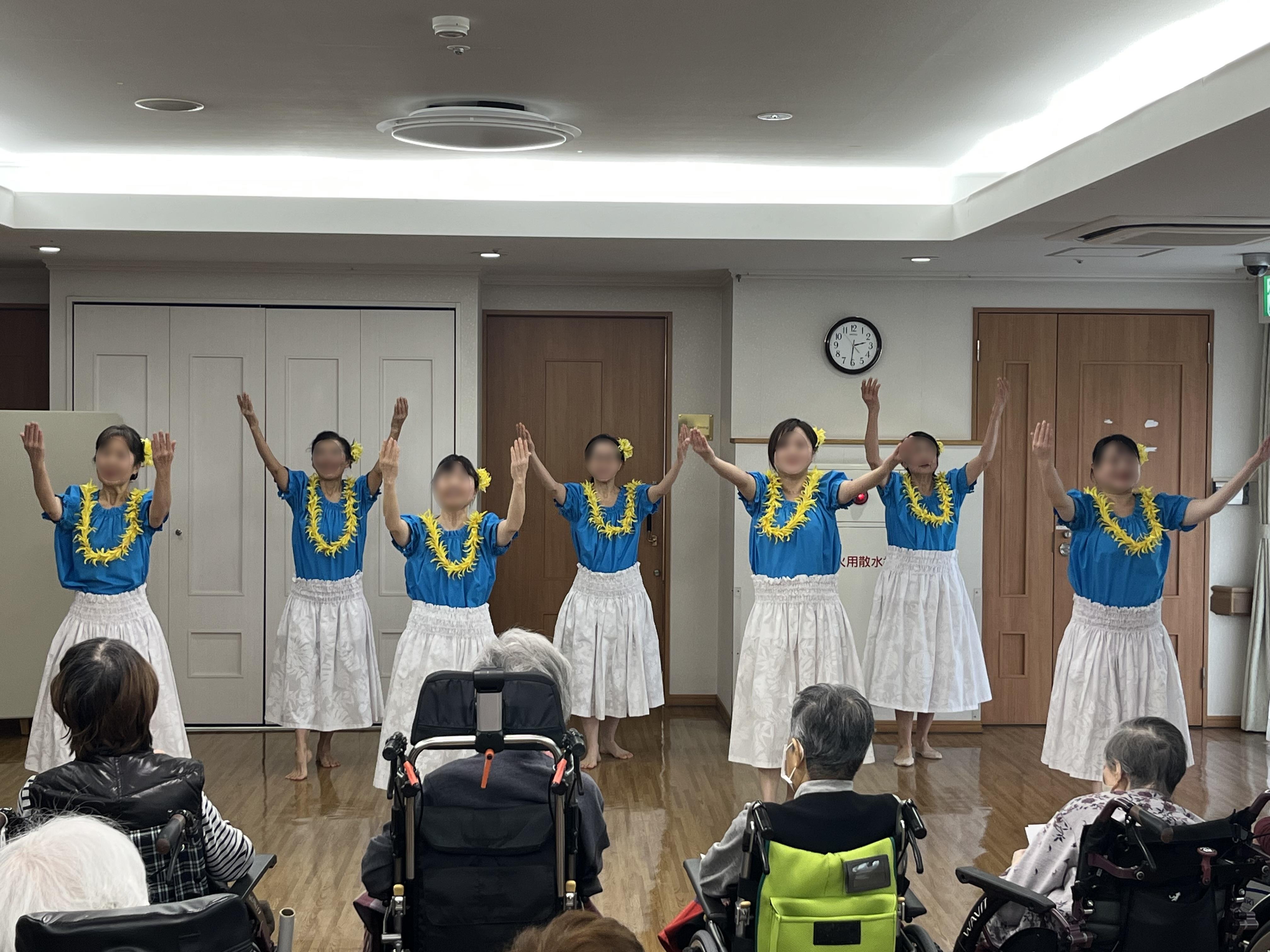 フォトギャラリー 2025.01.30 フラダンス 1月19日(日)にお越し頂いた7名のボランティアさんにフラダンスを披露して頂きました。皆さん、緩やかな音楽と踊りに見惚れ、素敵な時間を過ごされていました!! < 節分レク七夕まつり >